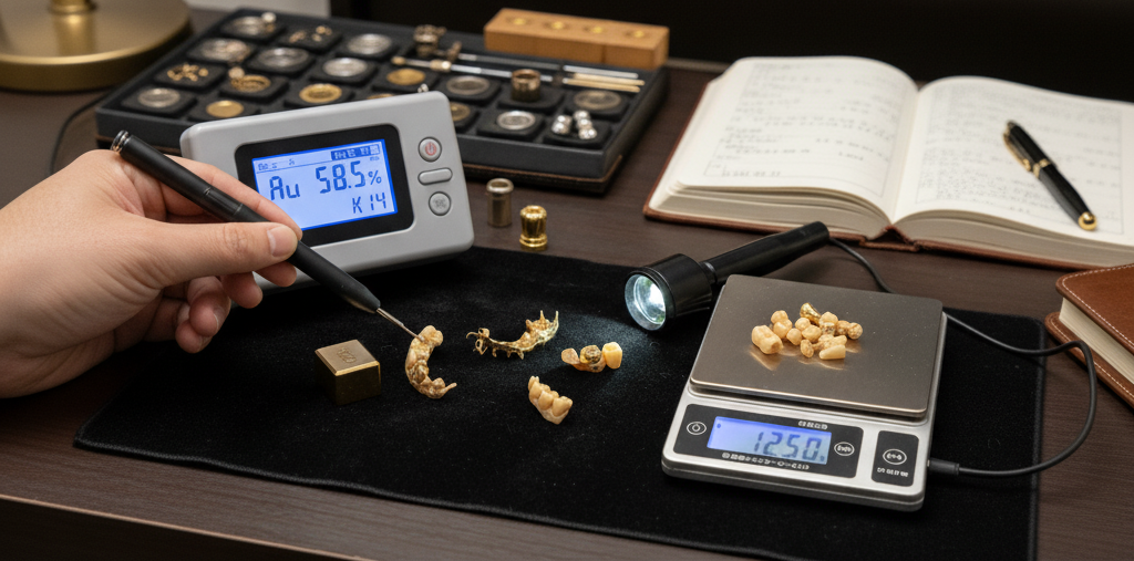 査定の際は、専用の機器を用いて金歯に含まれる金の含有量(純度)と重量を正確に測定します。歯科治療に使われる合金は、K14(純度58.5%)やK20(純度83.5%)といった純度のものが多く、そのグラム単位の重さが、そのまま買取価格の基準となります。